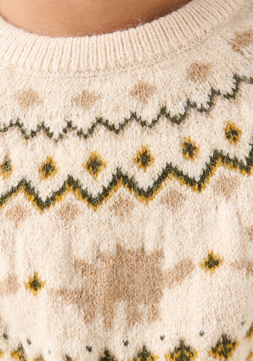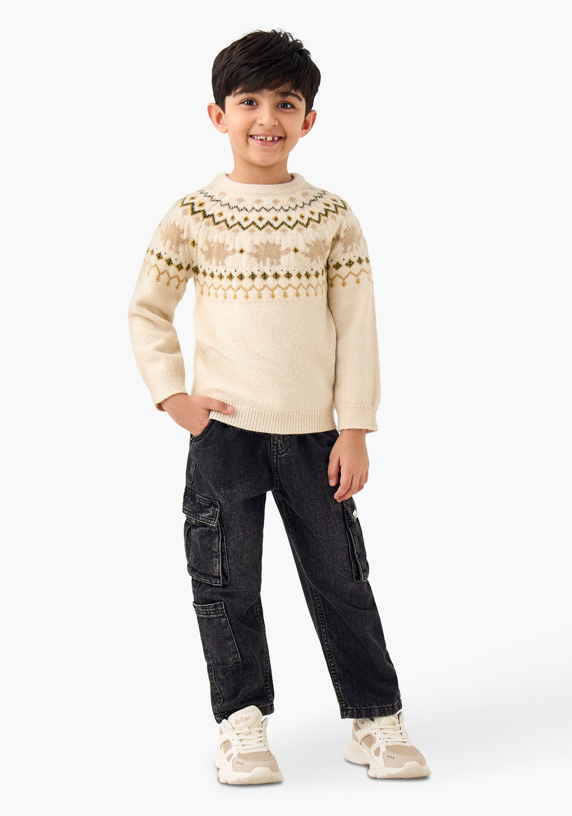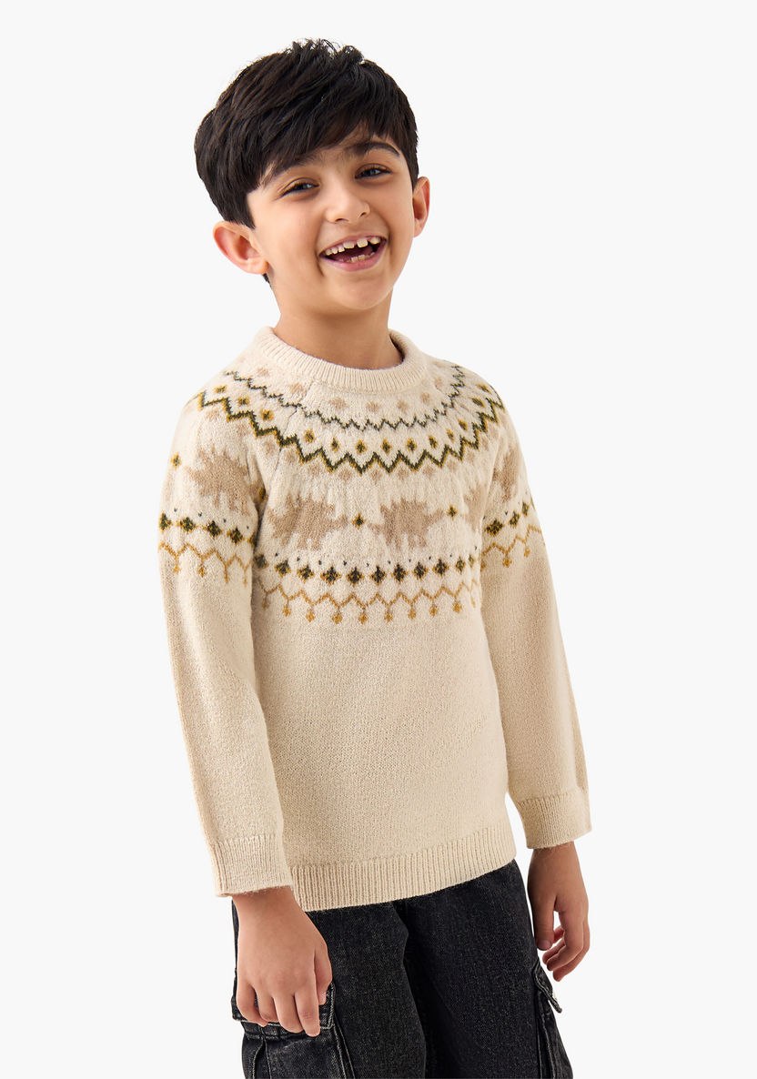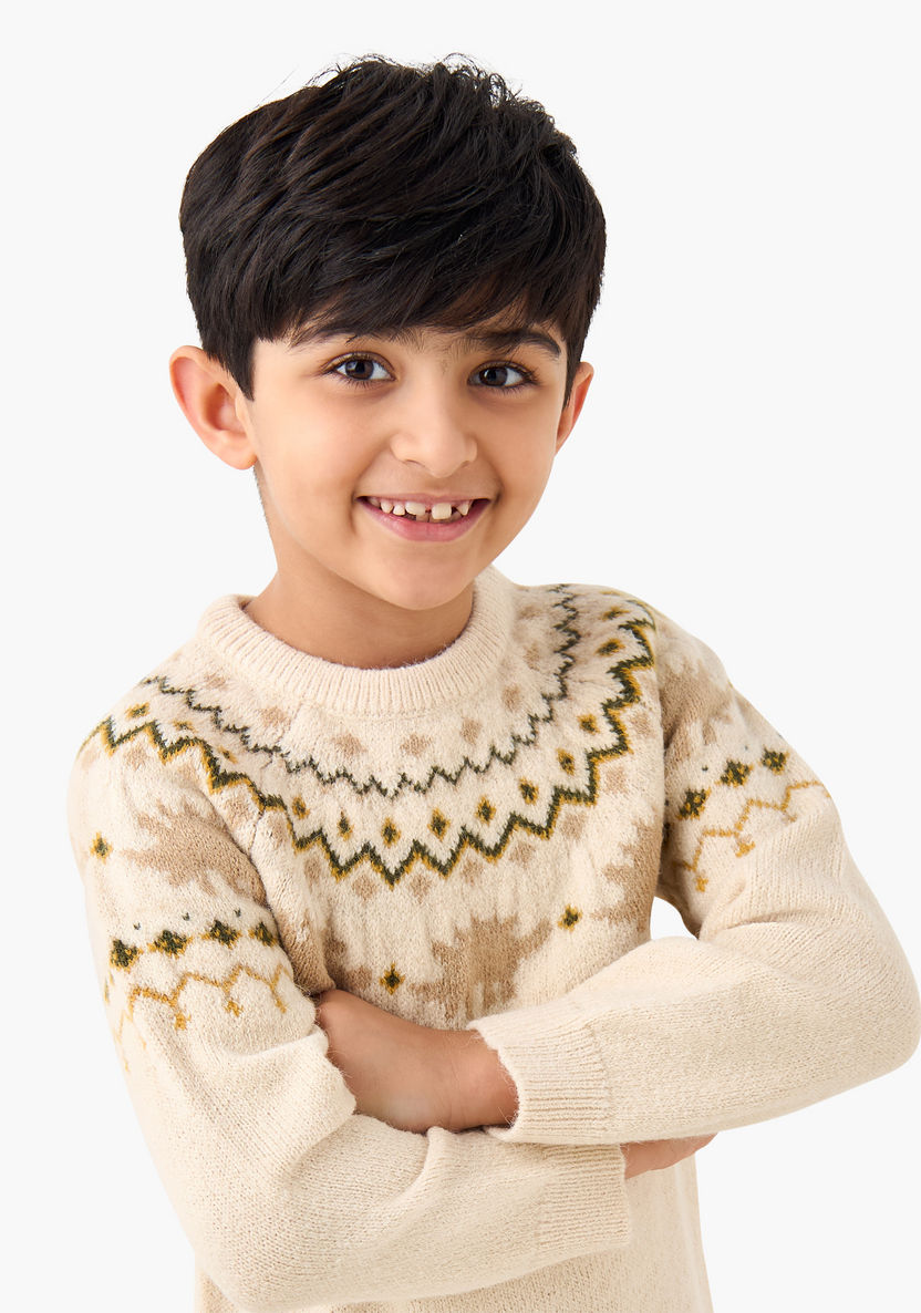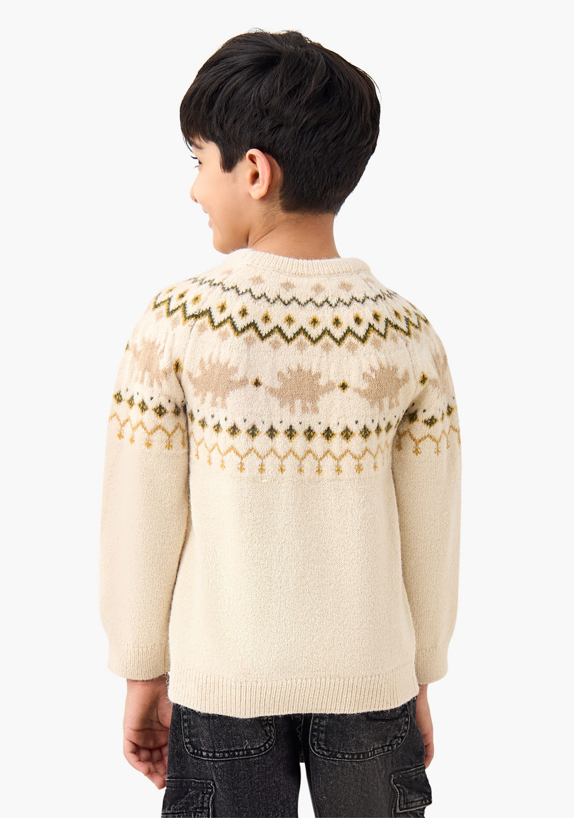 بلوفر محبوك للأطفال من Mothercare باللون البيج الفاتح، مُصمّم بنمط فير آيل الكلاسيكي على الصدر والأكتاف مع رسومات ديناصورات باللون البني والأصفر. تصميم مريح برقبة مستديرة وأكمام طويلة وحواف مضلّعة تحافظ على الشكل. خامته ناعمة ودافئة ومناسبة للّبس اليومي، والستايل محبوب وسهل يتباع لأنه مطلوب جدًا للأطفال.