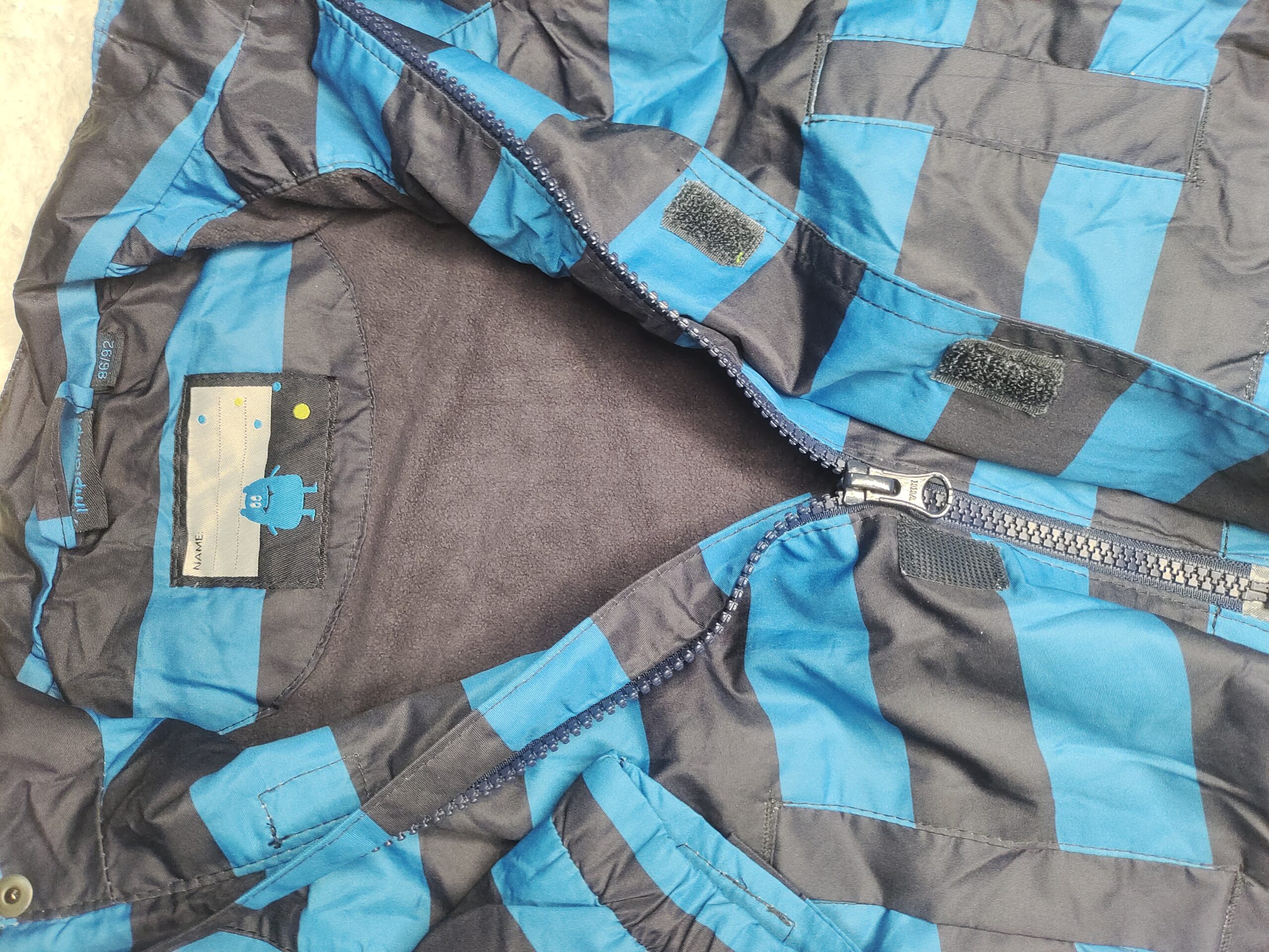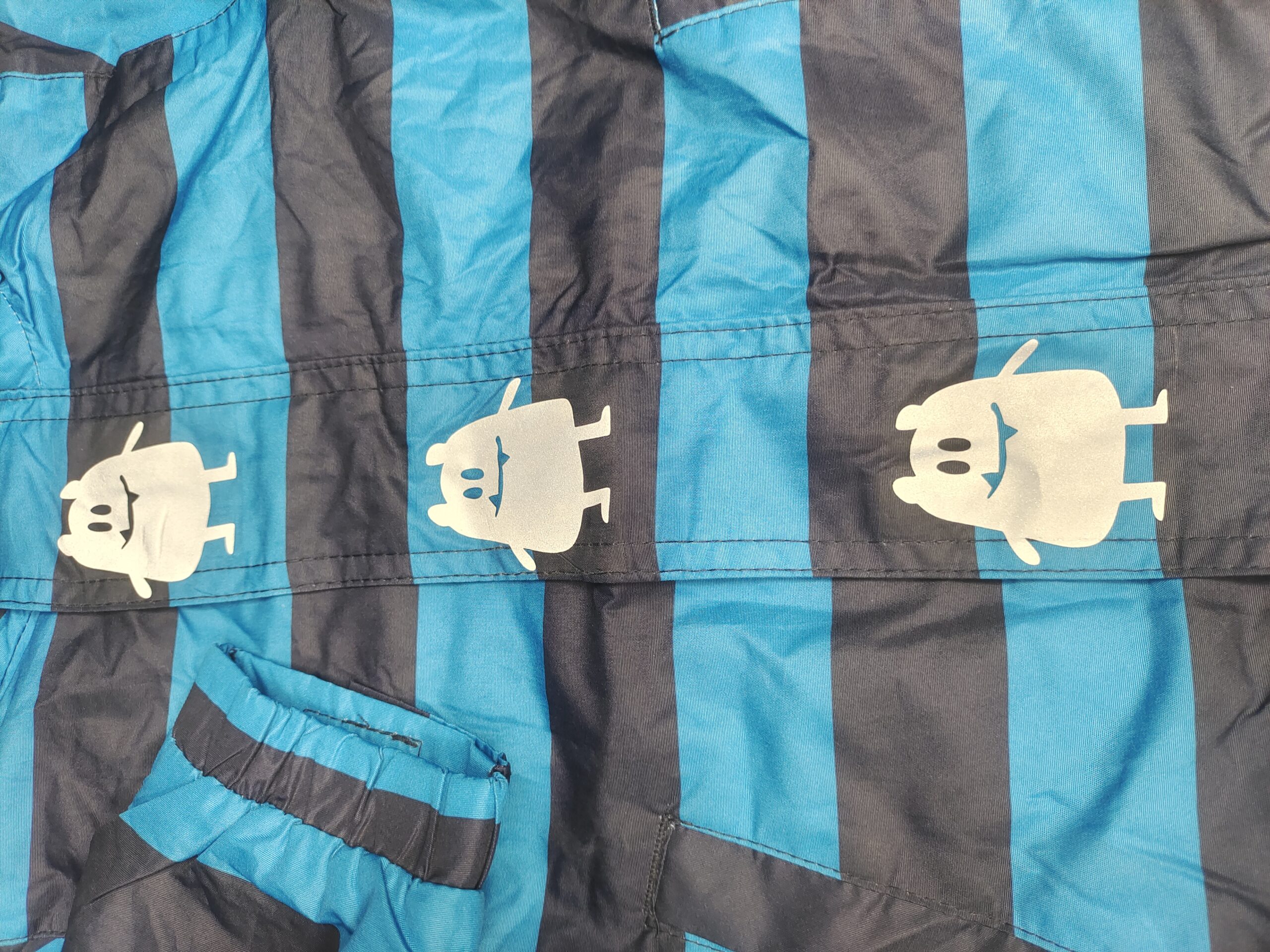 التصميم: يتميز بخطوط أفقية باللونين الأزرق الغامق والفاتح ورقع بيضاء على شكل أشباح صغيرة موضوعة عموديًا على طول الجاكيت.
