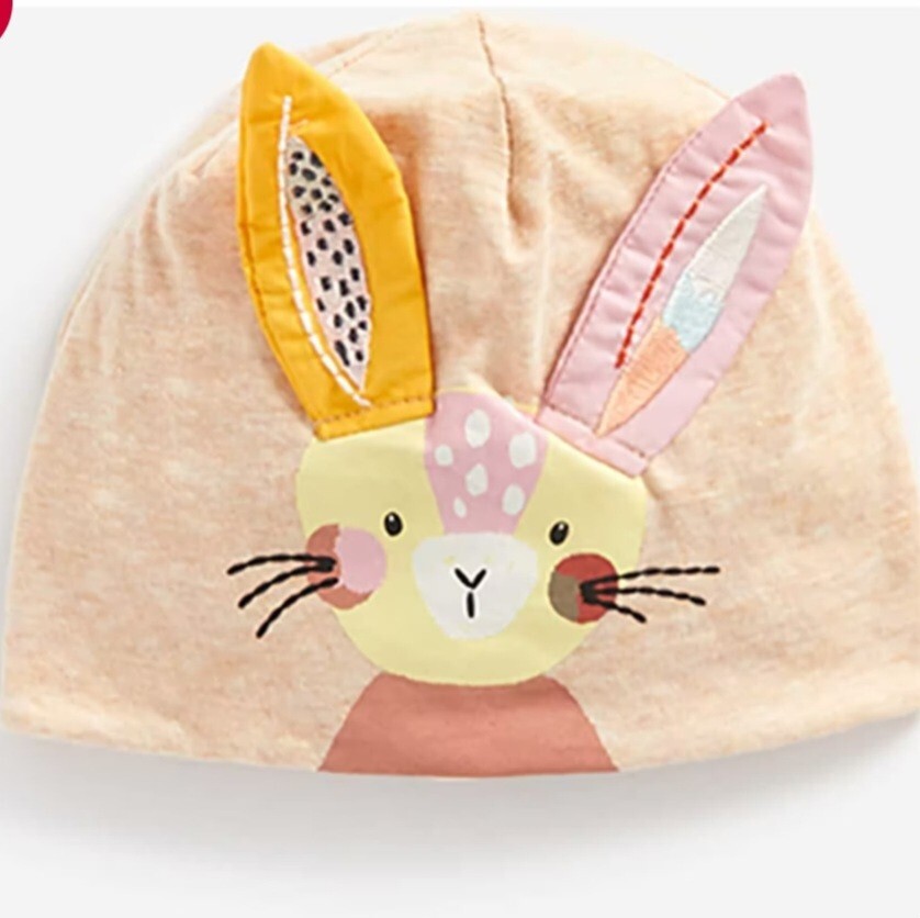 القبعة المعروضة في الصورة مصنوعة من قماش خفيف الوزن باللون الوردي/البيج مع تطريز لوجه أرنب وأذنين بارزتين ومبطنة لراحة الطفل. Mothercare