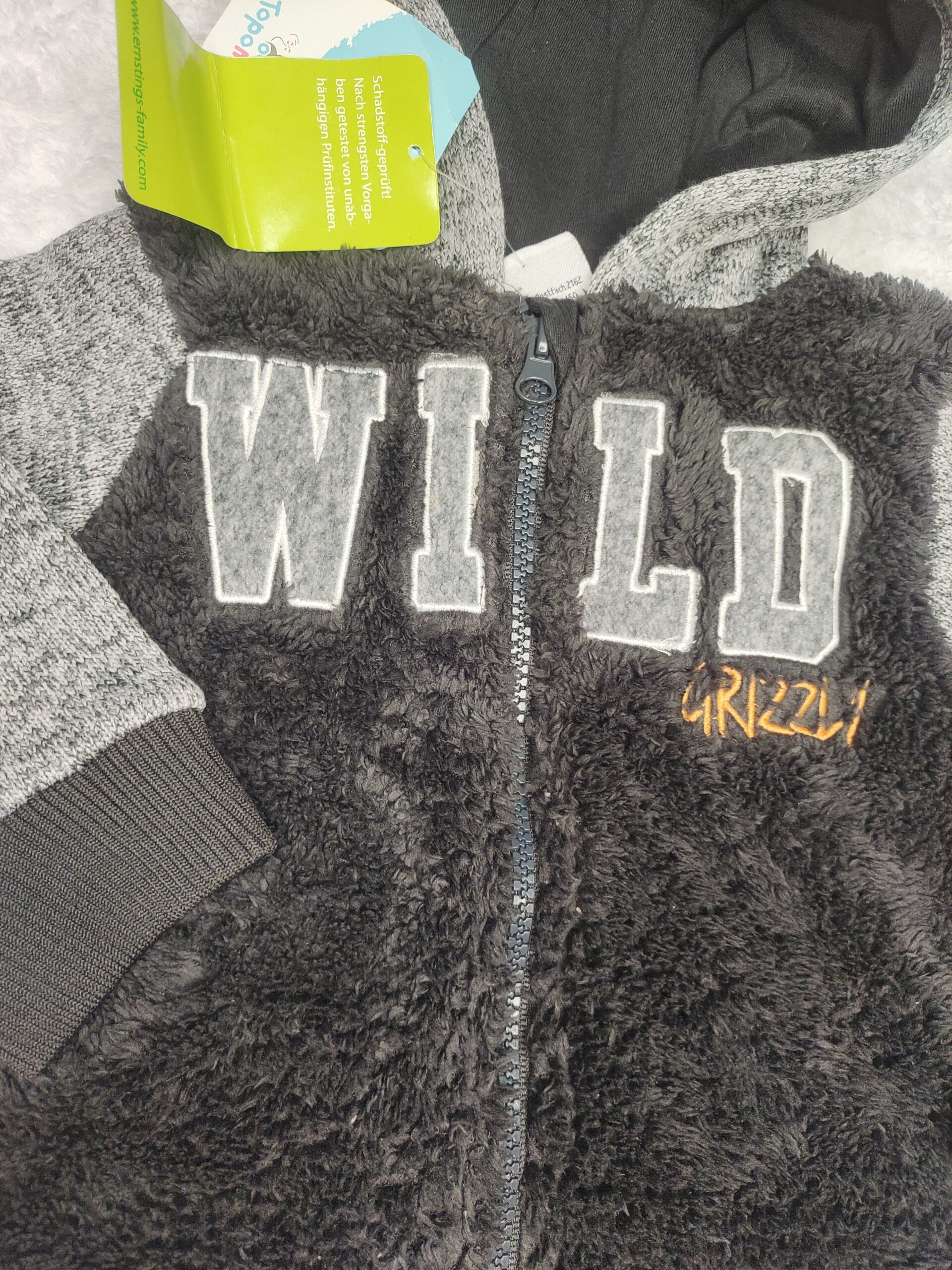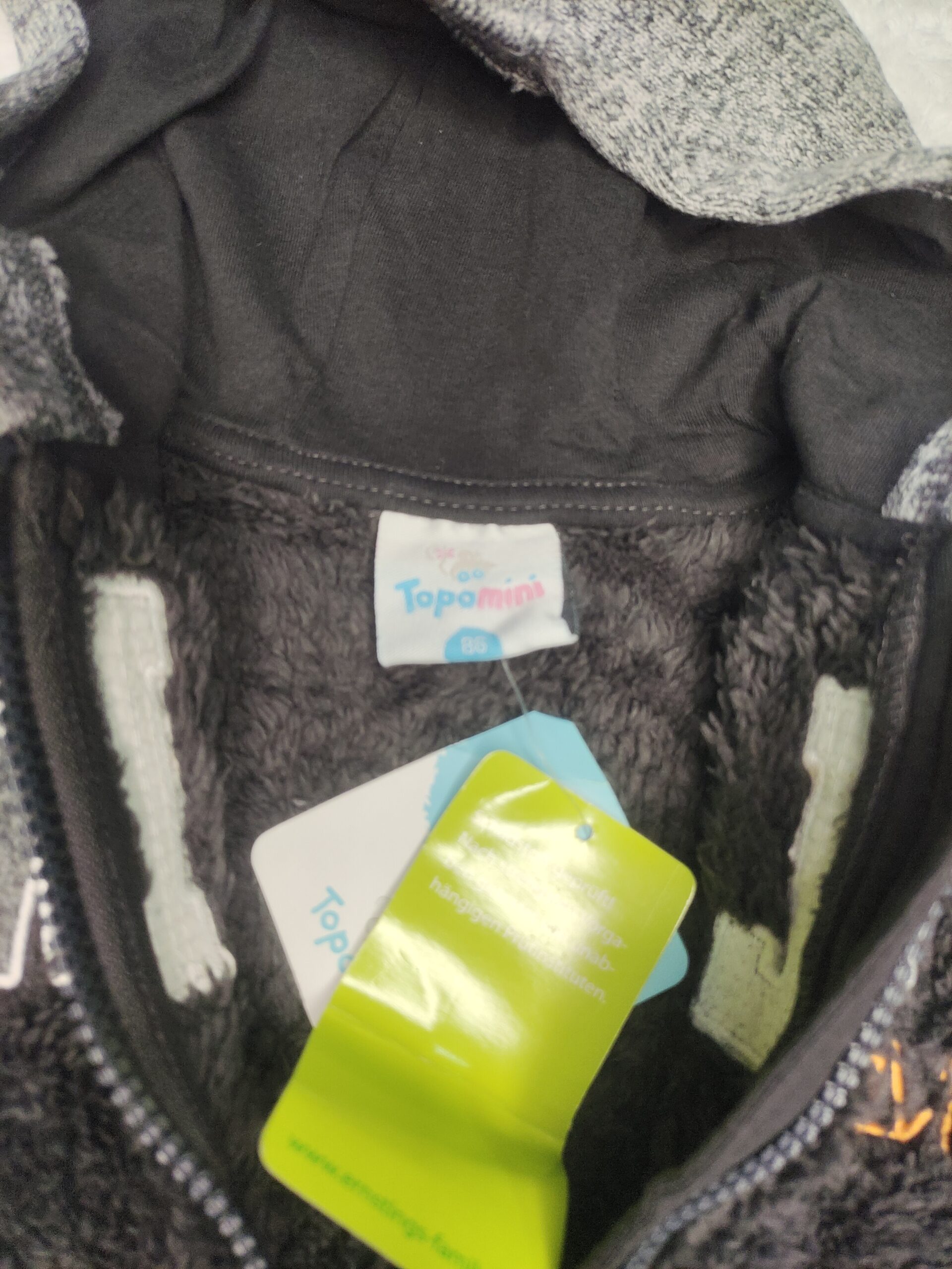 الخامة: الجزء الأمامي من الجاكيت مصنوع من فرو التيدي الناعم، بينما الأكمام مصنوعة من قماش منقوش.